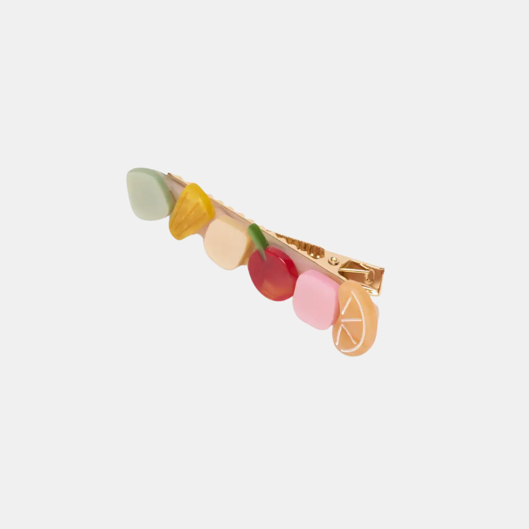 A clip inspired by the beloved but controversial ambrosia salad. Perhaps it is an acquired taste, but this clip is sure to delight anyone! Pastel marshmallows, and miniature pineapple, cherry, and mandarins make this alligator clip the cutest confection!