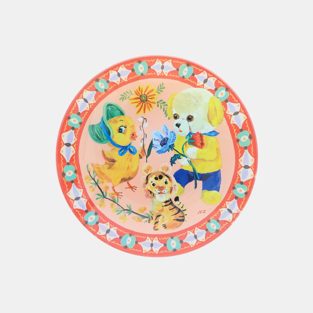 A dainty tempered glass dish featuring illustrations from Nathalie Lété.