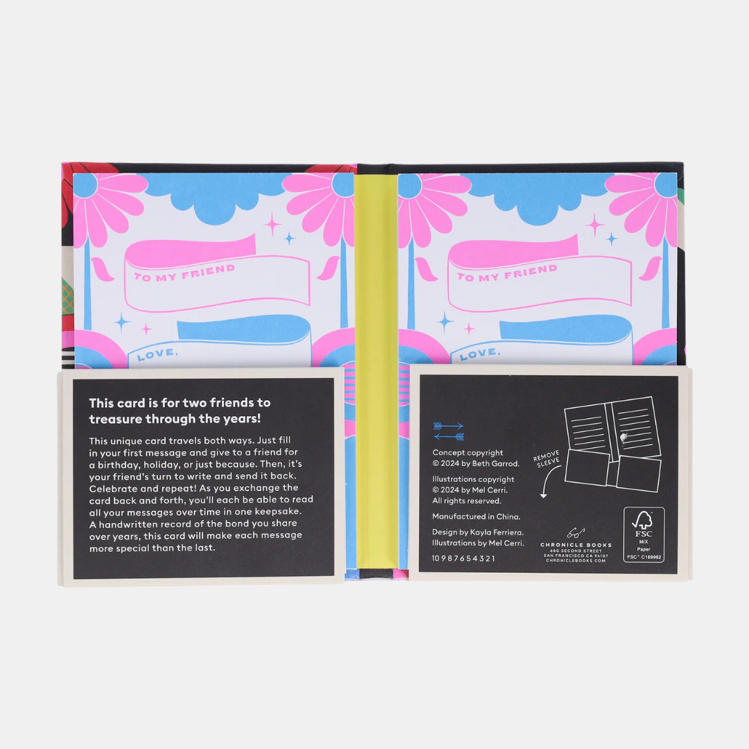 Designed to be exchanged again and again, this continuous card is like dozens of greeting cards in one. It travels both ways between besties: Just fill in your first message and give to a friend for a birthday, holiday, or just because. Then, it’s their turn to write and send it back whenever they choose. Celebrate and repeat! As you fill the card, you’ll each be able to read all your messages over time in one place. A handwritten record of the bond you share over the years, this is a keepsake you'll treasure forever.