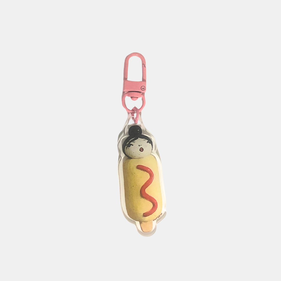 An acrylic charm keychain depicting a Munbeibi dressed as a corndog! Double sided acrylic makes this keychain durable and keeps the artwork from scratching and fading.