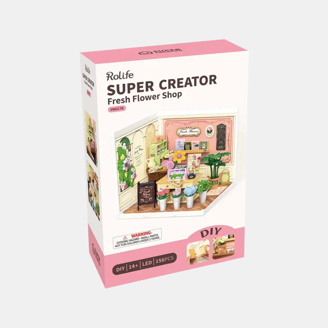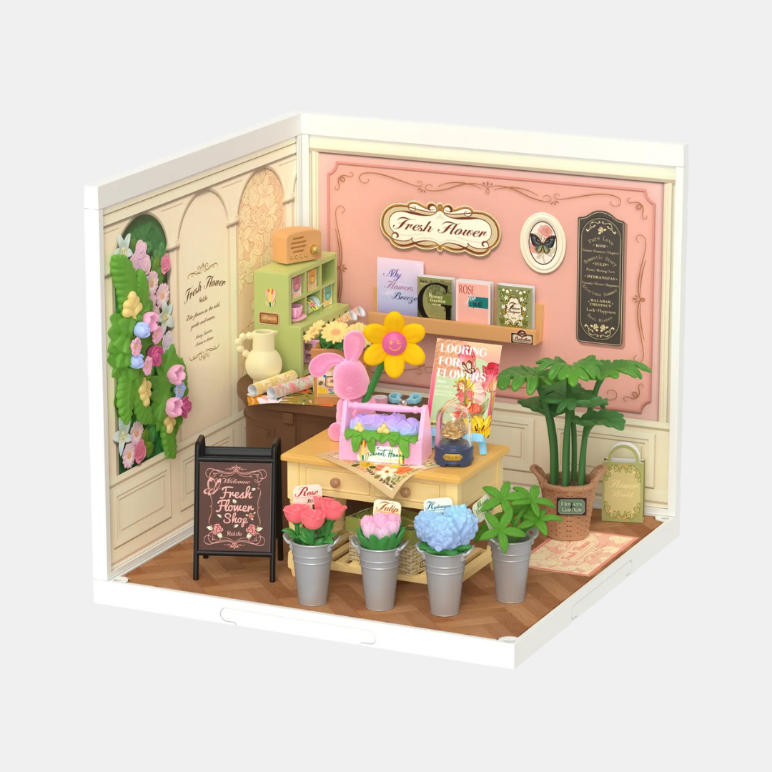 Fresh Flower Shop is a plastic DIY miniature building kit. The finished miniature can be connected with others in the series to create a dollhouse style setting. Build this miniature flower shop with your own hands and enjoy the happiness it brings to you!