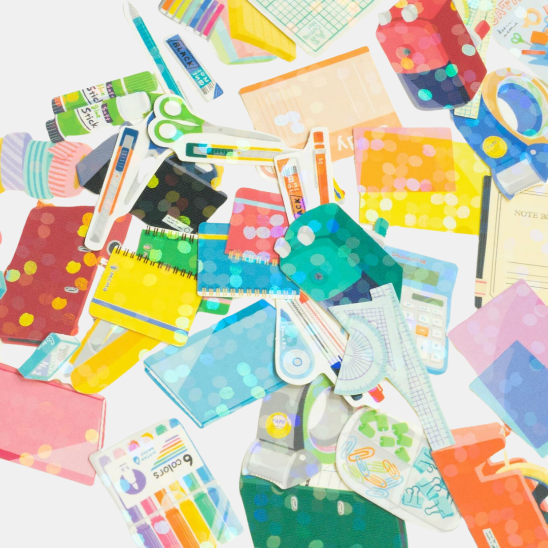 This cute little box holds a set of 40 holographic office supply themed stickers!