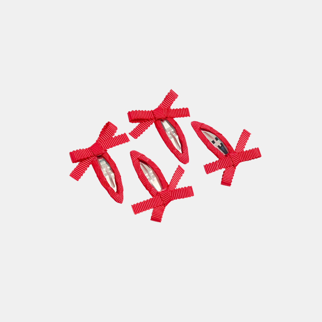 Four mini metal snap clips wrapped up in ribbon, topped with a bow. Perfect for all hair types and textures. Metal hardware is lead and nickel-free.