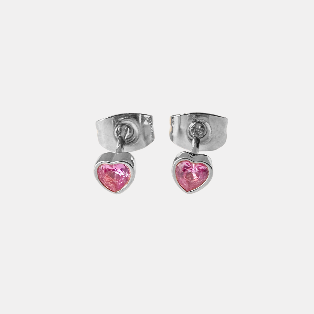 Tiny bezelled pink crystal heart studs. Wear these shimmering beauties solo or alongside your favourite studs or hoops.