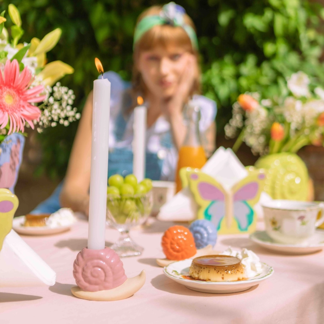 A ceramic candle holder, shaped as a snail, to bring a charming cottage ambiance into your home.