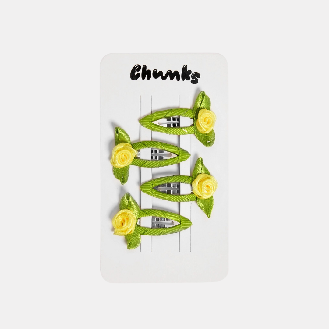 Four mini metal snap clips wrapped up in ribbon, topped with a rosette. Perfect for all hair types and textures. Metal hardware is lead and nickel-free.